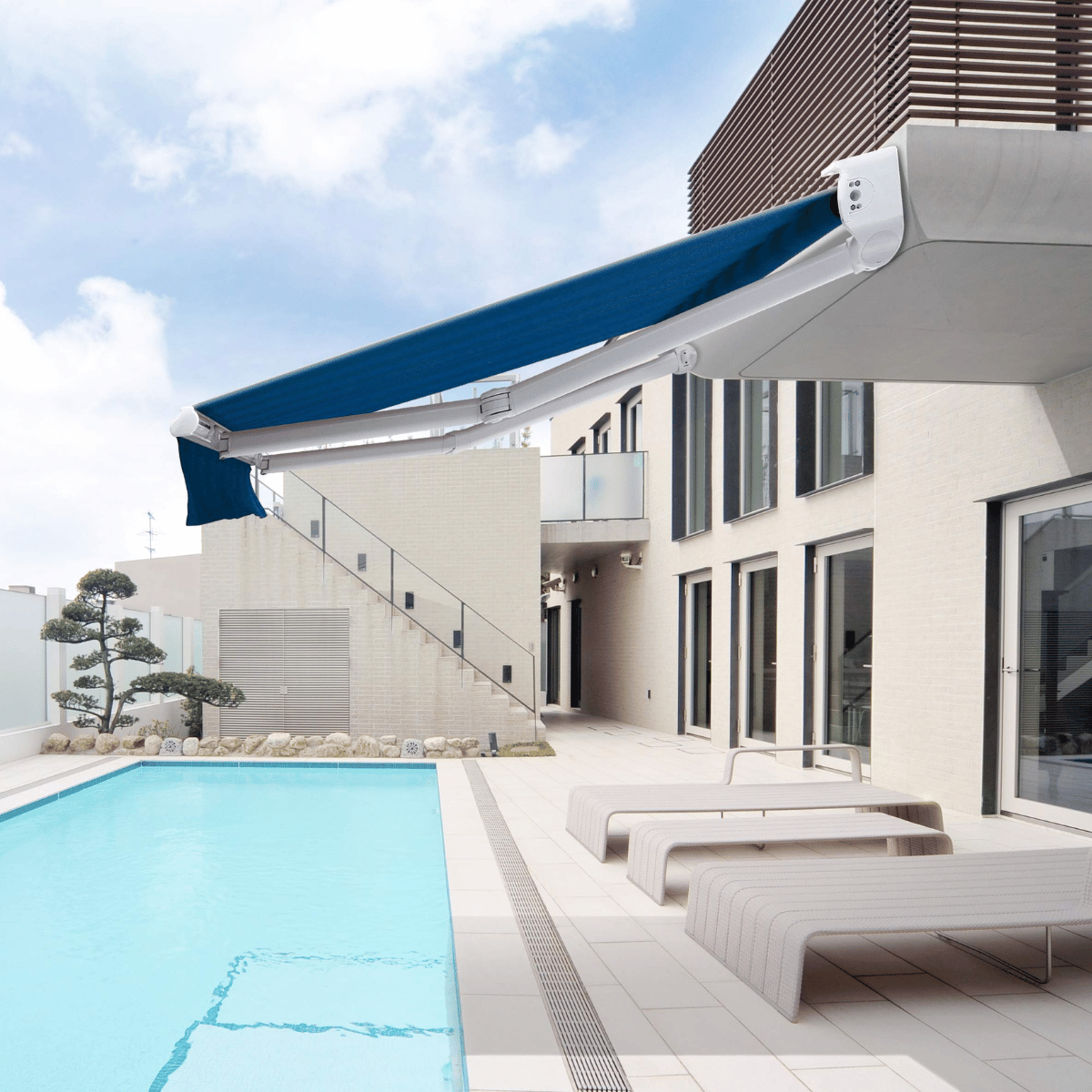 Tenemos soluciones exclusivas para la protección solar en exteriores, como son toldos verticales, brazos extensibles, pérgolas romanas, sombrillas, donde cada accesorio son resistentes a la interperie y diseñados para cubrir grandes áreas. Se utilizan materiales resistentes a los rayos UV, no se decoloran, y con un acabado especial llamado Texgard Easy Clean® que los hacen repelentes al agua y la suciedad y estructuras de la mas alta calidad.